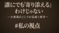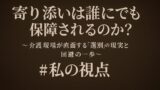だからこそ、どちらか一方だけが黙って傷ついて、何となくケアが回っているように見える構造ではなく、お互いが人として尊重される関係の中でケアが成り立っていく仕組みが必要だと思うのです。